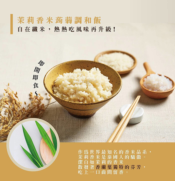 🌾【自在食刻】蒟蒻調和飯|低卡泰香米×蒟蒻完美比例減醣拌飯首選|熱量僅1/3|可鹹可甜|吃得飽也吃得巧!🥢香氣、口感、營養一次到位!我們將世界級泰國香米與Q彈蒟蒻完美調和,在保留濃郁米香與飽足口感的同時,大幅降低熱量與碳水,實現你對「美味×健康」的理想追求!🌟兩款經典調和:🍚茉莉香米蒟蒻織米|柔白如茉莉,香氣撲鼻,口感鬆軟,適合搭配鹹食或甜品🍇泰皇黑莓果蒟蒻米|富含花青素與鐵質,Q彈微甜,口感豐富,適合冷熱料理都百搭✅商品特色- 熱量僅為一般米飯 1/3